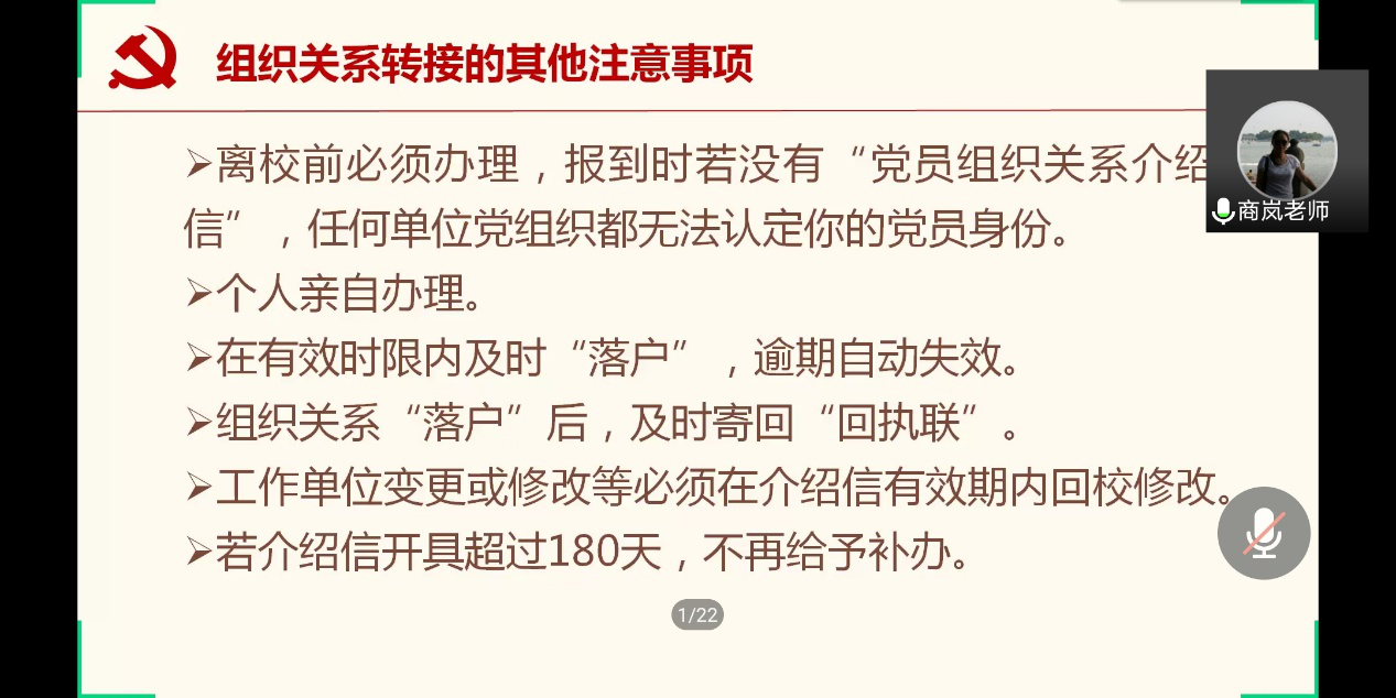 会后,组织员商岚从什么是党员组织关系转接、党员组织转接流程及注意事项等方面对党员组织关系转接问题进行详细介绍。
