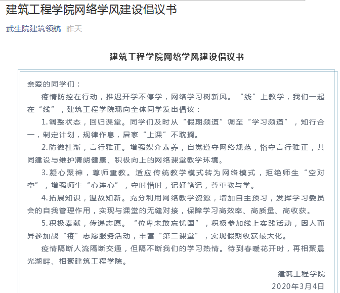 此外,学院还面向全体家长、学生发布《建筑工程学院疫情防控期间学风建设倡议书》,利用微信学院举行网上家长会,家校合力,共促学风的环境。