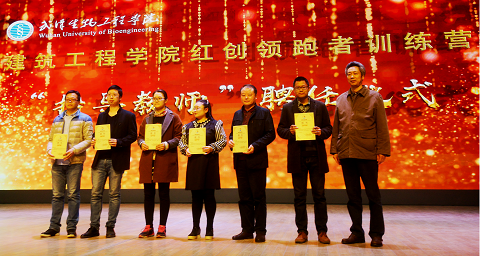 图为校党委常委、组织部部长宋能文(右一)为胡长威、李俊、黄瑶、毛小敏、刘群、黄仕超等六名校内“指导老师”颁发聘书。