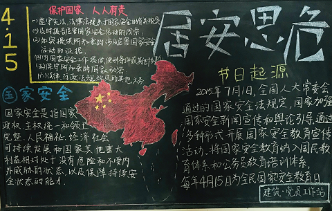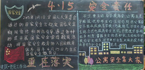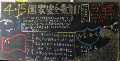 此外,为了更好的达到国家安全教育宣传作用,在我院学生制作了内容详细,绘画精美的黑板报放置在各个寝室门口,供来往学生学习。