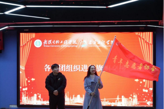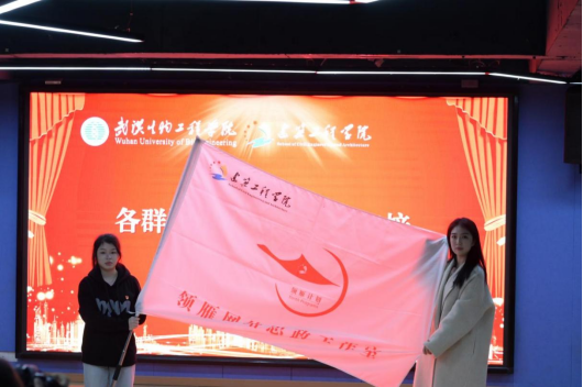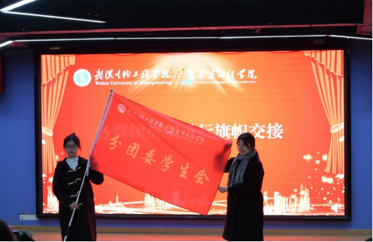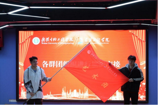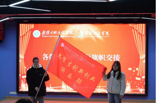 阮思琪向胡晓宁移交大学生创新创业俱乐部旗帜