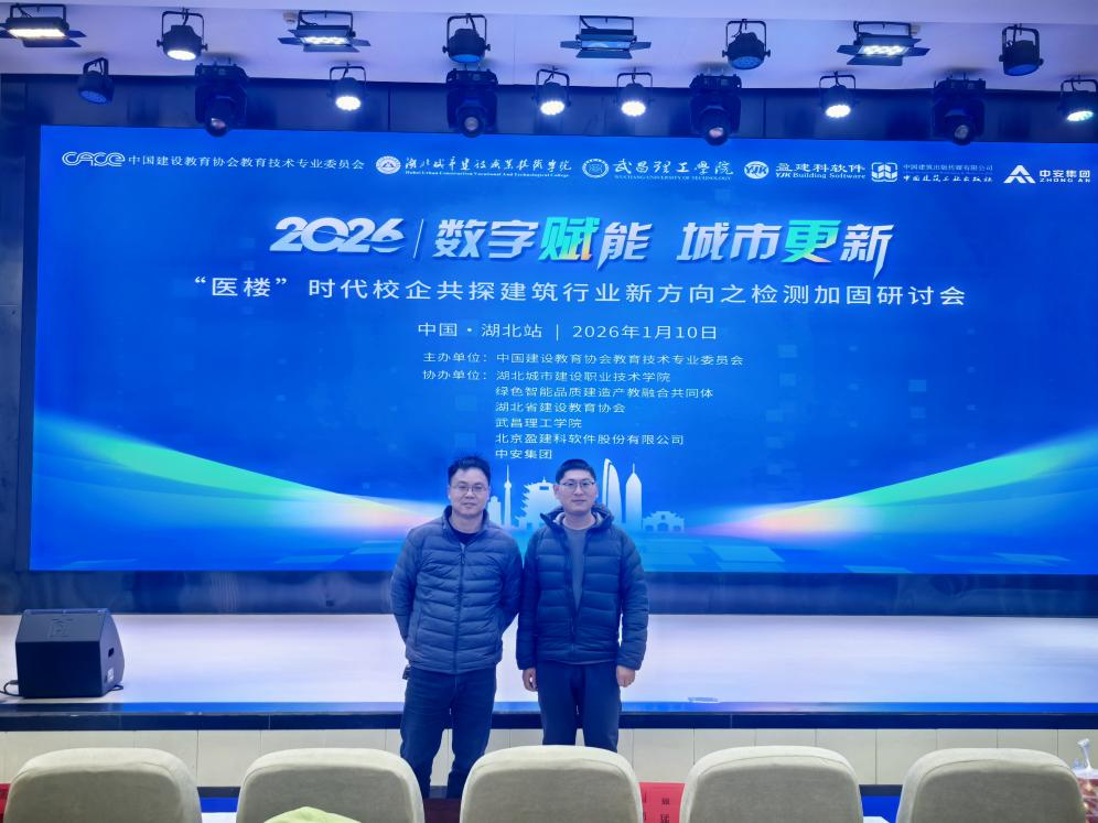 本网讯(通讯员 祝美)为深入贯彻国家城市更新战略,推动专业建设与教学改革,1月10日,建筑工程学院杨应平、郑自海两位教师受邀参加由中国建设教育协会教育技术专业委员会主办的“数字赋能城市更新—‘医楼’时代校企共探建筑行业新方向之检测加固研讨会(湖北省)”。本次会议在湖北城市建设职业技术学院召开,汇聚行业专家、高校学者及企业代表,共同探讨建筑检测加固领域前沿技术与发展趋势。