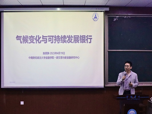 4 月 19 日,为拓展学生眼界,提供更多就业机会,管理学院请到中南财经政法大学金融教授陈思翀在六号楼东方红报告厅开展气候变化与可持续发展分享会。