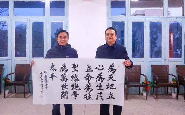 贾巨川教授在延安精神教育馆挥毫泼墨,写下“为天地立心,为民生立命,为往圣继绝学,为万世开太平”与师生共勉