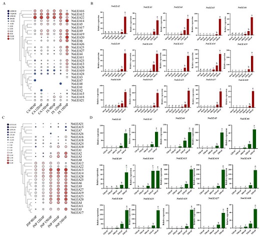 莲发育过程中NnLEAs的表达分析。(A)莲子叶发育和(B)莲子心不同发育期间NnLEAs的表达模式。qRT-PCR分析不同时期莲子叶(C)和莲子心(D)中NnLEAs表达模式。