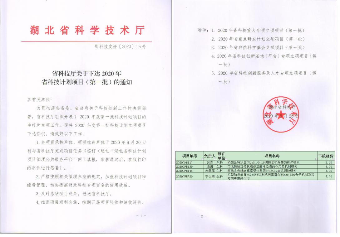 7月,我校生命科学与技术学院青年博士教师汪杰的《硝酸盐转运基因OsNPF5.16调控水稻分蘖的机理研究》项目、青年博士教师易凯的《丙戊酸钠对带状疱疹后遗神经痛的作用研究》项目、青年博士教师刘磊磊的《草地贪夜蛾SfABCC2基因表达调控研究》和长河青年学者李么明副研究员的《乙型脑炎病毒NS2bNS3切割抗病毒蛋白RNase L的分子机制及其对病毒感染的作用》项目获批2020年度湖北省自然科学基金立项,经费共计20万元。我校在全省同类高校中获批项目数量继续保持领先。