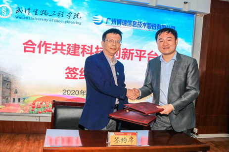 广州博瑞信息技术股份有限公司湖北分公司总经理张俊涛(左)与我校校务委员、建筑工程学院院长刘怿凡(右)代表双方签署了校企共建平台合作协议。