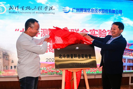 广州博瑞信息技术股份有限公司集团总公司总工办总工程师吴绪志(左)与我校科技处处长袁飞荣(右)为校企共建平台“北斗测量联合实验室”揭牌