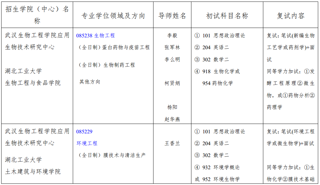 2.湖北工业大学、武汉生物工程学院将在网上及时发布招生相关信息,请考生在报名、初试、复试、录取等阶段上网查询,也可直接与相关招生单位联系。