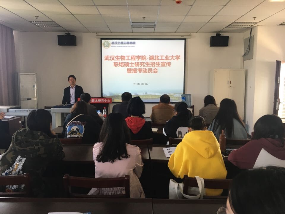 (通讯员 韩洋洋)10月16日上午,在应用生物技术研究中心8楼会议室,武汉生物工程学院联合湖北工业大学举行了2019年联合培养研究生招生专题活动。我校6名联培硕士研究生导师代表,以及来自生命科学与技术学院、药学院、化学与环境工程学院、食品科技学院有意考研的80余名同学参加了该项活动。