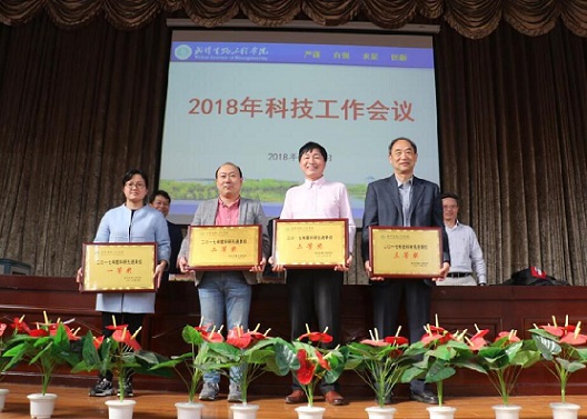 会上,工作人员宣读了学校《关于2017年度优秀科研成果的通报》《关于表彰2017年度科研先进单位的决定》。图为校领导为2017年度科研先进单位颁奖。