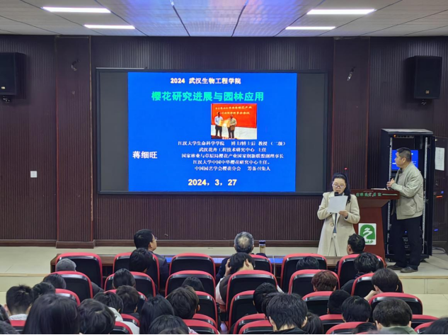 本网讯(通讯员:朱文佳)繁花照水影徘徊,武汉樱花复盛开。为营造学院学术氛围,提升学生专业兴趣,普及中华樱花知识,3月27日,园林园艺学院特邀江汉大学中国中华樱花研究中心主任蒋细旺教授,在园林楼报告厅开展以“樱花研究进展与园林应用”的专题讲座,本次讲座由我院副院长唐艳平主持,全院师生代表参会。