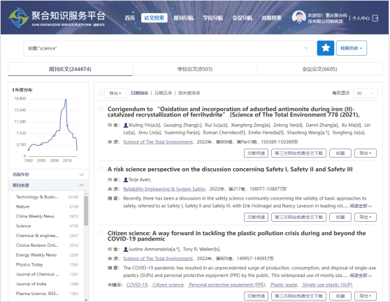 聚合知识服务平台(简称JKS),旨在为广大学者提供一个跨学科、跨文献类型、权威的知识发现平台。平台涵盖学科范围广泛,收录全球范围内利用率最高的外文期刊论文、会议论文、学位论文等多种资源类型,截止2025年11月收录文献9504万余篇,并持续更新数据,为学者及时有效地获取并利用知识与信息提供全方位服务。