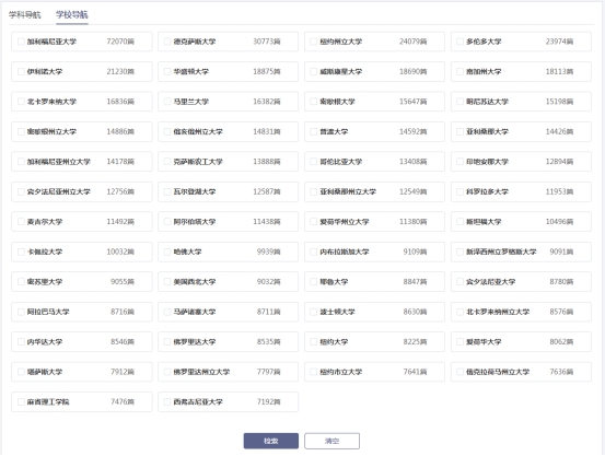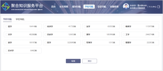 通过“学科”、“学校”进行导航检索,便捷浏览特定学科、学校相关博硕士论文,支持多选功能。