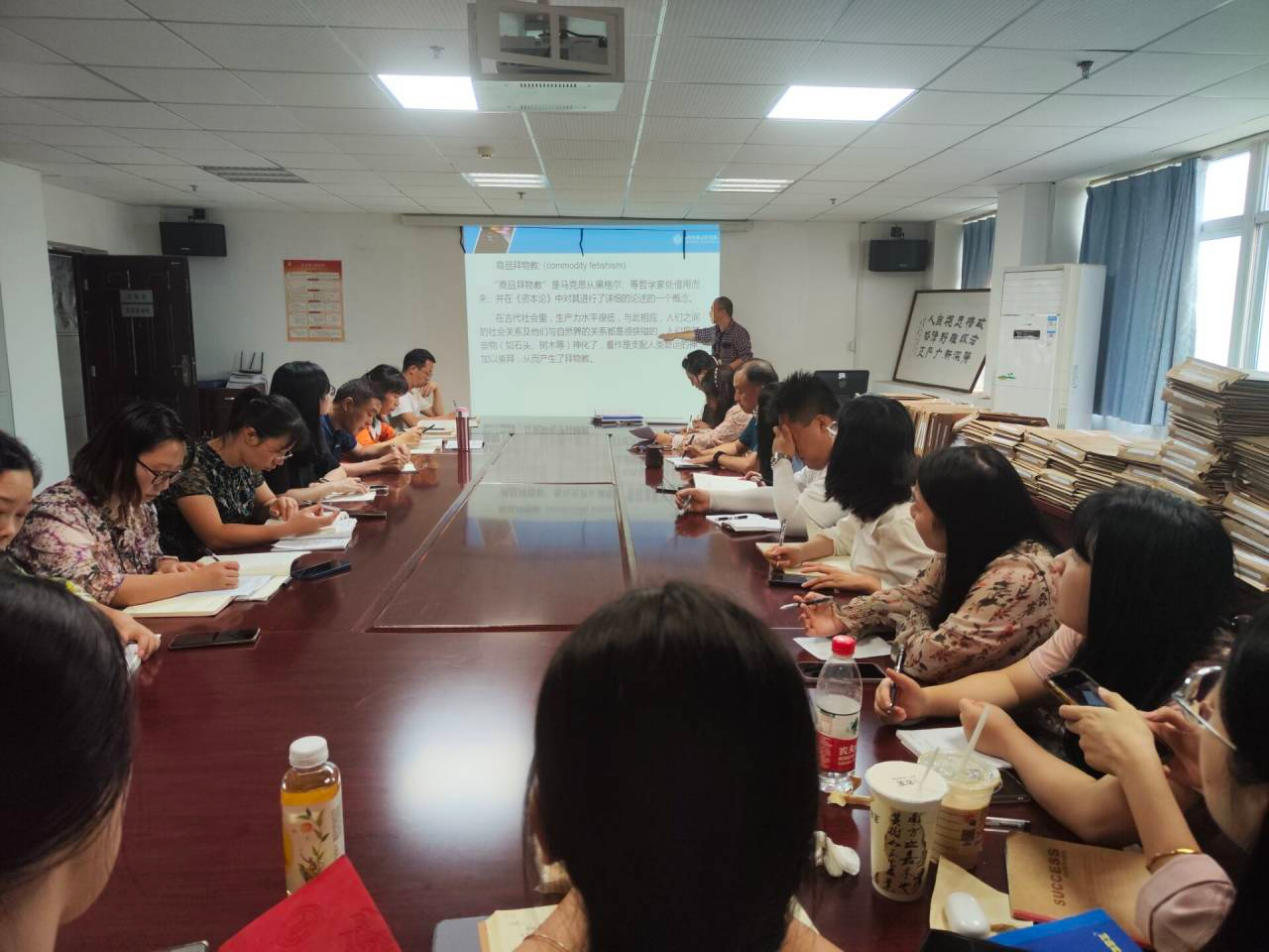 (通讯员:张杰)9月20日下午,马克思主义学院开展“强基工程”品读经典系列分享活动,本期由我院专任教师李辉向马院全体教师分享了对于马克思主义理论经典著作《资本论(第一卷)》中的“商品的拜物教性质及其秘密”解读。本次活动由马克思主义学院副院长喻小莉主持,马院全体教师参加。