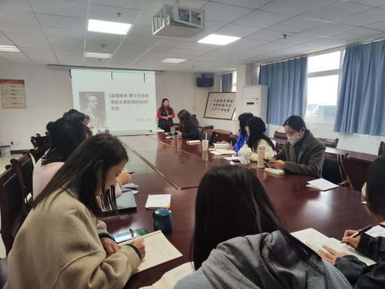 (本网讯)11月15日下午,马克思主义学院开展“强基工程”读书分享活动,本期由我院张杰老师向全体老师分享《路德维希·费尔巴哈和德国古典哲学的终结》一书。本次活动由马克思主义学院副院长喻小莉主持,马院全体教师参加。