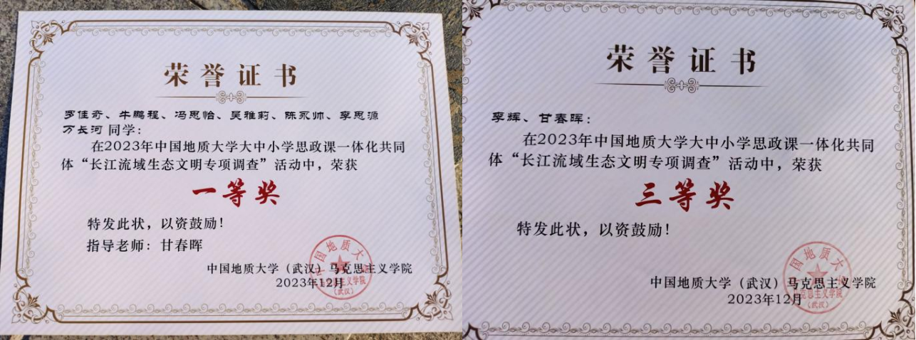 自中国地质大学“红绿蓝”大中小思政课一体化共同体启动仪式起,我校马克思主义学院作为第一个共建单位与中国地质大学(武汉)一直积极配合共商共建,共同致力于共同体合作发展。一是我校马克思主义学院孙厚权院长带领甘春晖和朱丹丹两位教研室主任出席启动仪式,并积极参加中国地质大学(武汉)马克思主义学院组织的参观学习活动。二是甘春晖老师按照中国地质大学(武汉)马克思主义学院制定的以“习近平总体国家安全观”为展示主题的“红绿蓝”大中小学思政课一体化共同体项目要求,撰写4千多字的红绿蓝”大中小学思政课一体化共同体教学方案,制作了精美规范的“党心民心+心心相印+双向奔赴+共同成就”(总体国家安全观)PPT,带领学生团队录制了十分钟的“党心民心+心心相印+双向奔赴+共同成就”(总体国家安全观)视频课,将此作为中国地质大学(武汉)一体化展示课程的重要组成部分。三是甘春晖老师利用假期和课余时间,带领2023级园林园艺学院园艺技术专科1、2班7名来自湖北省宜昌市兴山县不同村镇的学生,立足家乡开展调查,指导学生团队撰写调查报告,该《“青山绿水”和“金山银山”区域化和谐发展调研报告》获得“长江流域生态文明专项调查”一等奖。李辉老师和甘春晖老师利用暑假时间前往贵州省黔西南地区开展实地勘察后,立足当地旅游经济开发现状,分析研究后撰写的《新时代助力黔西南州文化生态旅游发展路径初探》获得三等奖。以上成果都是中国地质大学(武汉)牵头打造的一体化展示课程的重要组成部分。