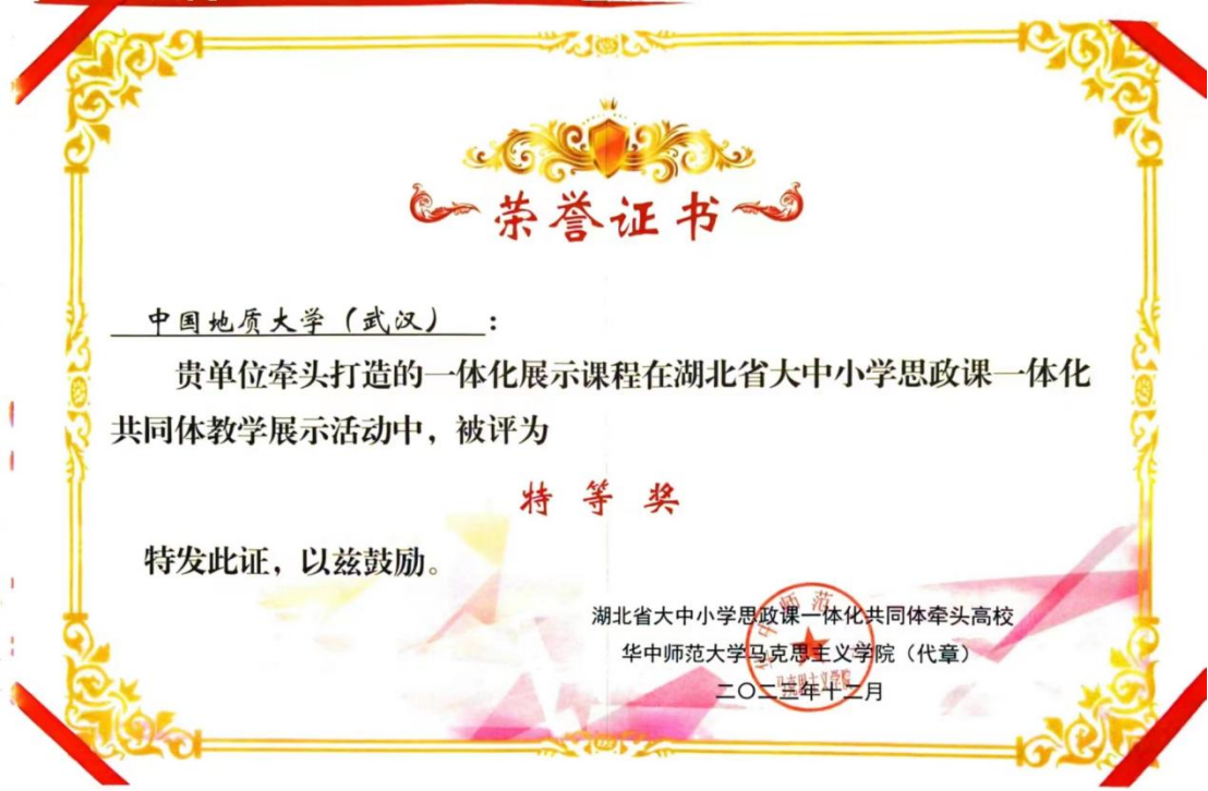 按照《教育部办公厅关于开展第三届全国高校思想政治理论课教学展示活动的通知》要求,全省各大中小学思政课一体化共同体建设综合改革示范区、综合改革示范校开展了2023 年度湖北省大中小学思政课一体化共同体教学展示活动。中国地质大学(武汉)牵头打造的一体化展示课程在湖北省大中小学思政课一体化共同体教学展示活动中,获得省级特等奖。我校马克思主义学院作为中国地质大学(武汉)第一个共建单位参与了共同体教学展示活动。