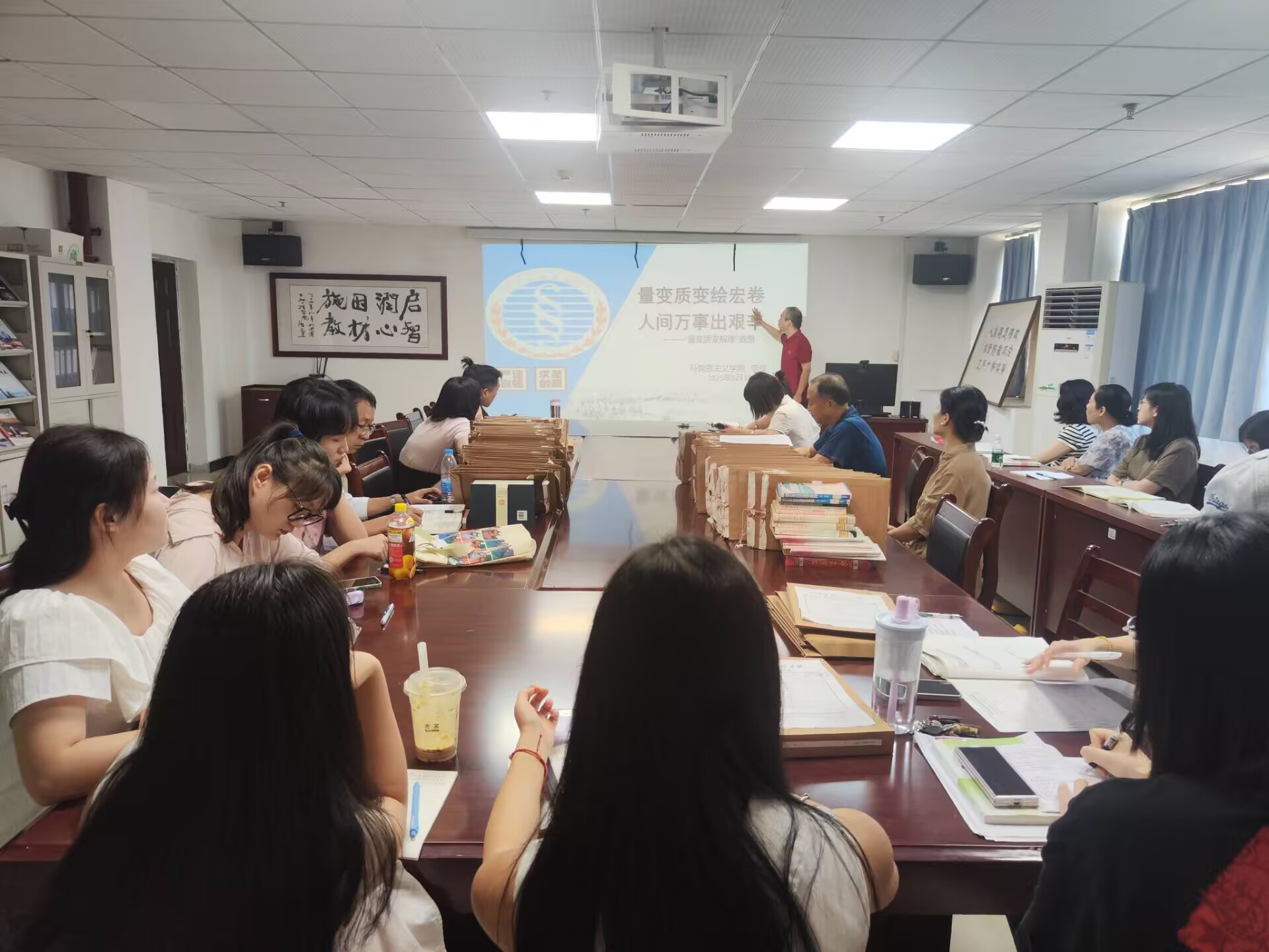 2025年9月17日下午,本学期第一次“能力提升工程”示范课在钱学森大楼805会议室举行,由李辉老师讲授《马克思主义基本原理》课程第一章“质变量变规律”,马院全体教师参加了示范课。
