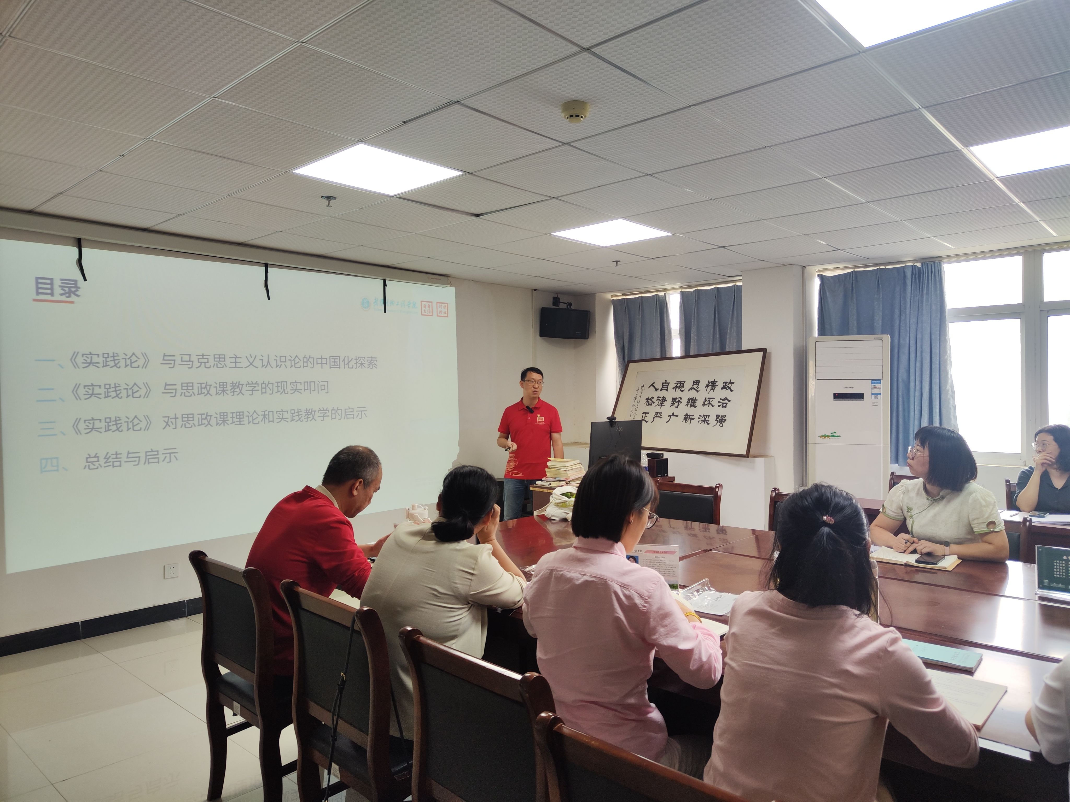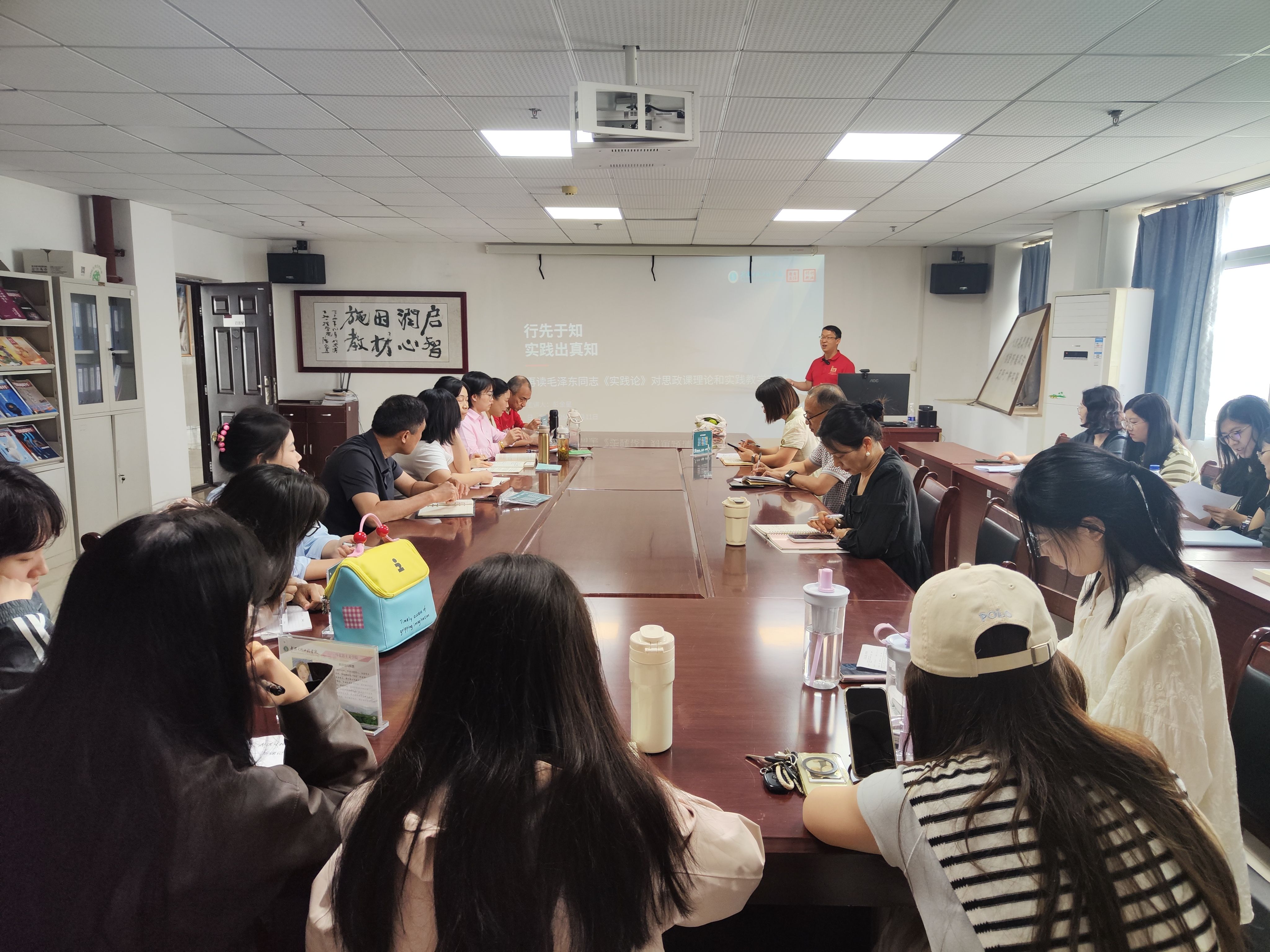 2025年10月11日下午,马克思主义学院全体教职工在805会议室开展了本学期第一场“强基工程”系列读书分享活动。本次活动由专任教师彭金星主讲,围绕“行先于知,实践出真知:再读《毛泽东选集》第一卷《实践论》对思政课理论与实践教学的启示”主题,重点聚焦新时代思政课教师如何用《实践论》指导开展思政课理论和武生院校本实践教学。