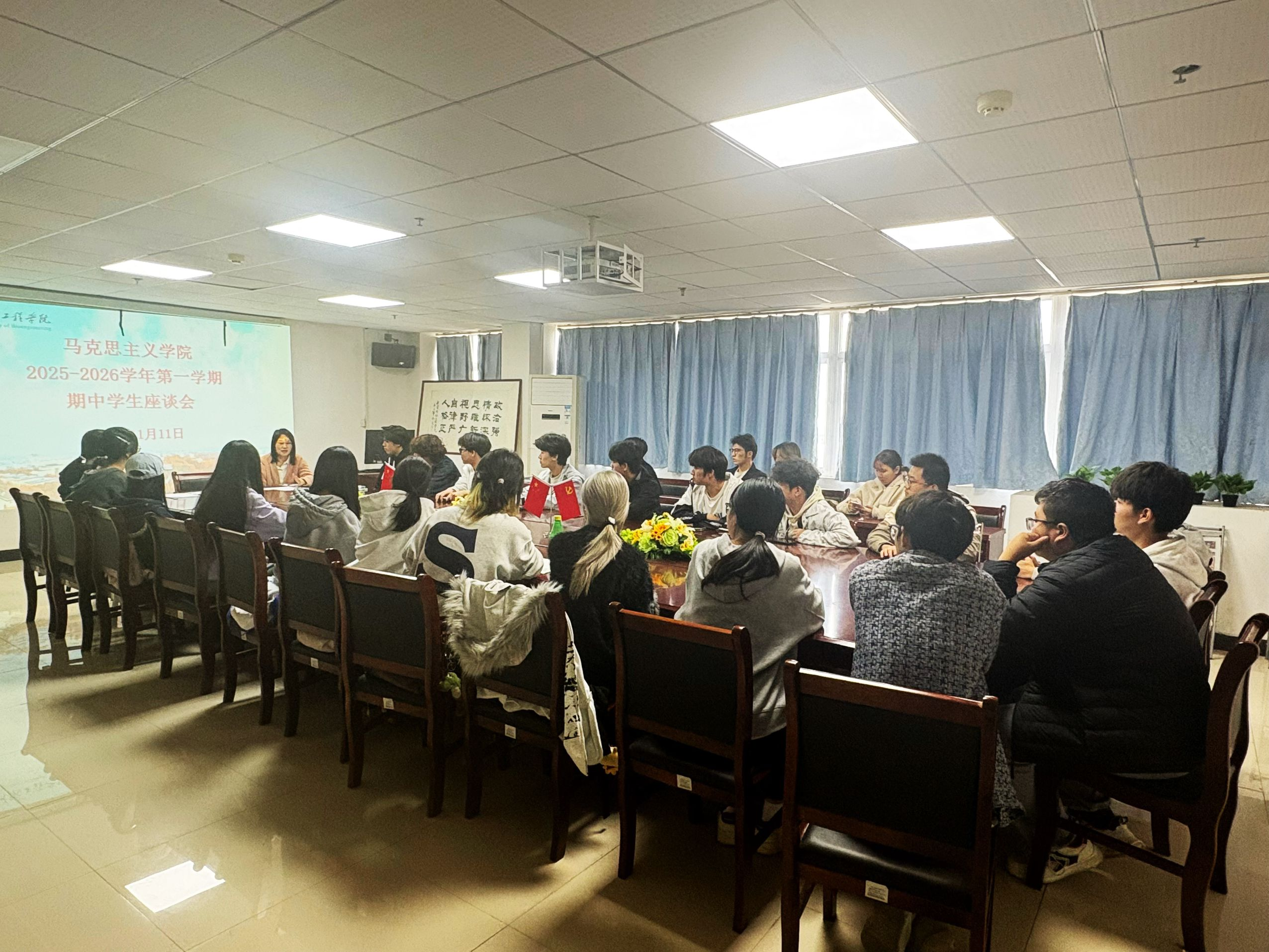 为全面掌握期中教学运行实际情况,畅通学生意见反馈渠道,精准对接学生学习需求,进一步提升《思想道德与法治》课程教育教学质量,11月11日德法教研室召开2025-2026学年第一学期期中学生座谈会。院党支部副书记、院长助理朱丹丹出席会议,来自11个学院的26名本专科学生代表参会,会议由教研室赵磊老师主持。