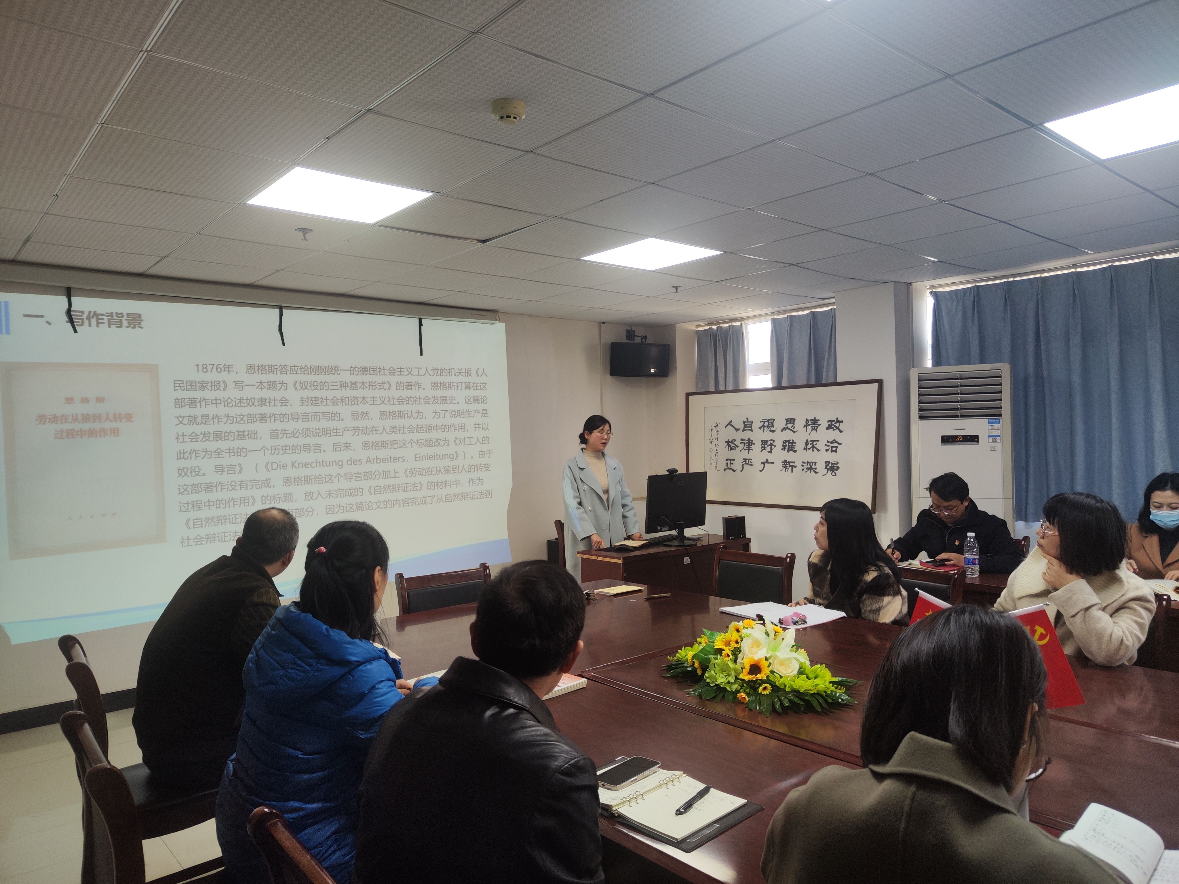 为进一步提升教师思政育人水平,创新教学方法,2025年11月26日下午,马克思主义学院在钱学森大楼805会议室开展了本学期第四场“强基工程”读书分享活动。本次活动由胡静玲老师主讲,主题为《劳动在从猿到人转变过程中的作用》导读,带领大家穿越时空,探寻人类起源的奥秘,并深刻领悟其跨越时代的思想魅力,学院全体教师参会。