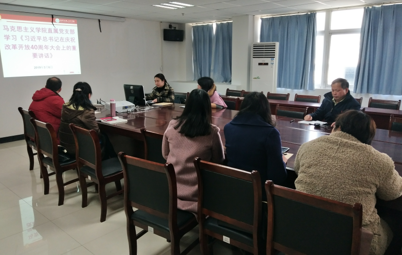 (通讯员:甘春晖、郭辉)2019年3月6日下午,按照学校党委的统一要求,马克思主义学院全体党员教师在直属党支部副书记喻小莉的主持下学习了《习近平总书记在纪念改革开放四十周年大会上的讲话》,马克思主义学院直属党支部沙永金书记出席了本次会议。