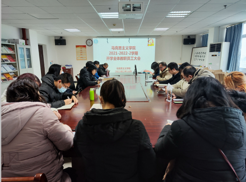 2月16日上午9:30,马克思主义学院召开开学初全体教职员工大会。全体专职和校内外兼职教师参加了会议,学院负责人沙永金同志传达了学校2022年教育教学工作要点,结合马院实际,布置了马院全年和开学初重点工作,对以往工作中存在的问题进行了指正,并提出高标准工作要求。