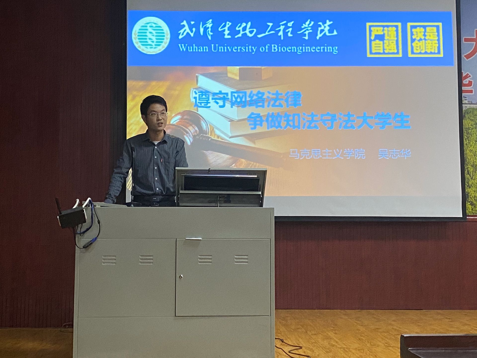 (本网讯通讯员:高春月)9月24日下午4:00-5:30,在一号楼西1101报告厅,马克思主义学院吴志华老师为医药学院120余位学生代表开展了一场以“遵守网络法律,争做知法守法大学生”为主题网络普法教育报告会,医药学院部分教师全程参加。此次报告会系学校网络普法教育活动第一场,后续宣讲正有序安排。