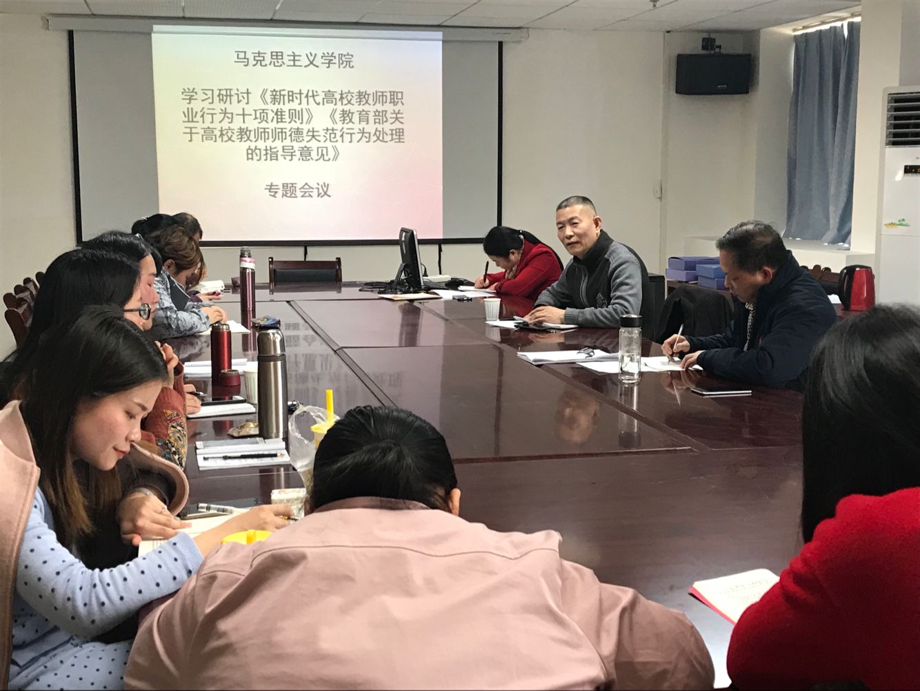 (通讯员:郭辉)11月27日下午,马克思主义学院在钱楼805召开关于师德师风建设,培育“四有”好老师和造就高素质教师队伍的研讨会。本次研讨会由马克思主义学院直属党支部书记沙永金主持,教务教学督导室张涛主任出席了本次研讨会。