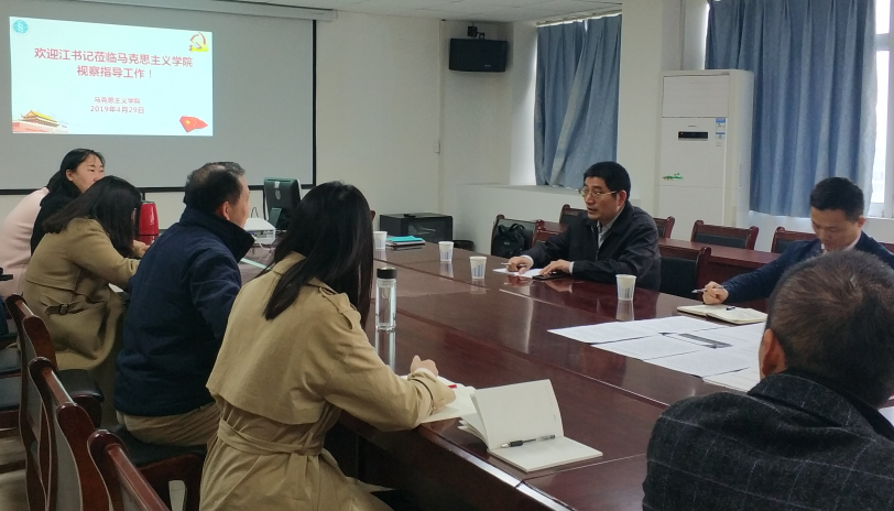 (通讯员:王雅莉)4月29日上午,校党委书记江珩同志一行来马克思主义学院调研指导工作。会上马克思主义学院直属党支部书记、副院长沙永金介绍了马院近期建设和教育教学情况。江书记对马院的工作表示肯定并对今后的发展和建设提出了意见和建议。校办主任余仕良、学生处处长王龙、组织部部长助理李丹陪同出席本次调研工作。