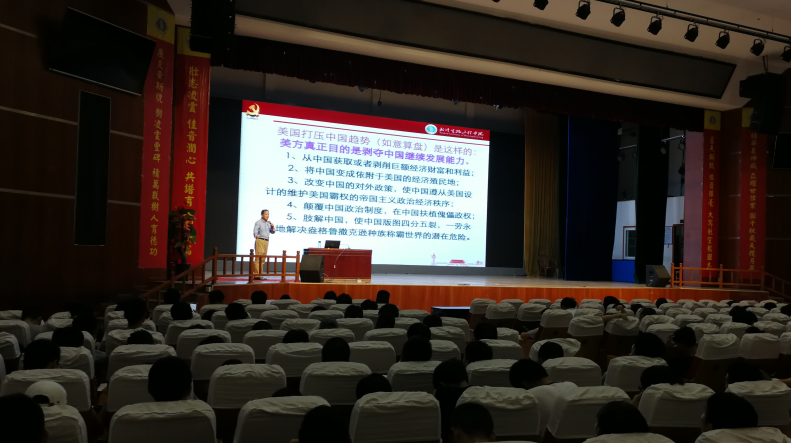 (通讯员;高春月、郭辉)5月31号下午四点,武汉生物工程学院2018—2019学年第二学期《形势与政策》报告会在学校大礼堂开讲。本次报告会由马克思主义学院副院长沙永金教授主讲,形势与政策教研室主任张琴主持,生科院、药学院、化环与食品学院、园林园艺学院、艺术学院、外国语学院2018级专科生和学生干部、党员、入党积极分子等共约950余位同学参会。