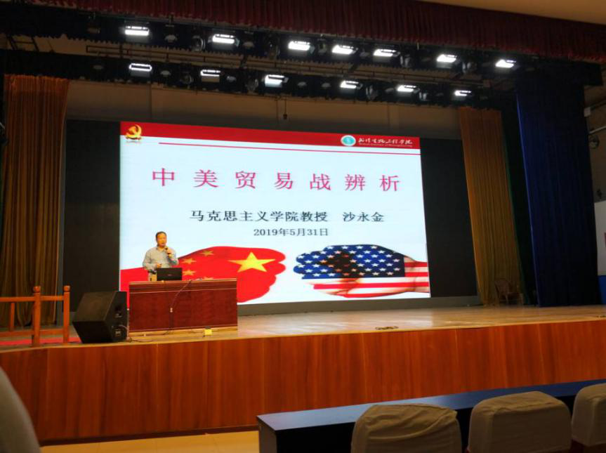 报告会以当前中美贸易摩擦演化过程为主线,从“近期中美贸易战大事和我国面临的困难”、“正确认识国际大势和中美关系”、“中美贸易战的根本原因和实质”、“应对与策略”四个方面展开。沙永金教授首先以电影《打败美帝野心狼》片段引入,回顾解放初期对美国的高度警惕和准确认识,接着用23个事件梳理了近期中美贸易摩擦的演化过程和来龙去脉,进而引导在场学生要正确认识国际大势和中美关系,并对中美贸易战的根本原因和实质进行深入剖析,在此基础上,提出了应对策略及当代大学生应如何认知、如何行动。