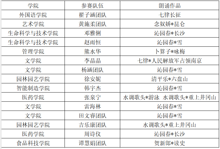 本次活动要求选参赛队伍围绕主题自选毛主席诗词篇目进行朗诵,可辅以音乐、画面等艺术形式;朗诵需情感真挚、语言流畅,体现对诗词内涵的深刻理解。评审将综合考查内容把握、语言表达、艺术感染力与创新性。现将晋级复赛名单公布如下: