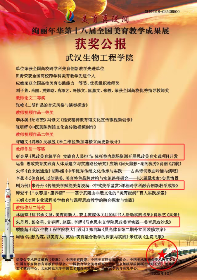 本网讯(通讯员清风)近日,由全国美育联盟、中国美育网等权威机构联合主办的“绚丽年华第十八届全国美育教学成果展”评选结果正式揭晓。作为全国高校美育领域极具影响力的专业赛事之一,本届成果展汇聚了全国百余所高校的优质美育教学成果,竞争尤为激烈。武汉生物工程学院教师凭借扎实的实践创新与鲜明的育人特色崭露头角,成功斩获教师作品类多个重要奖项。