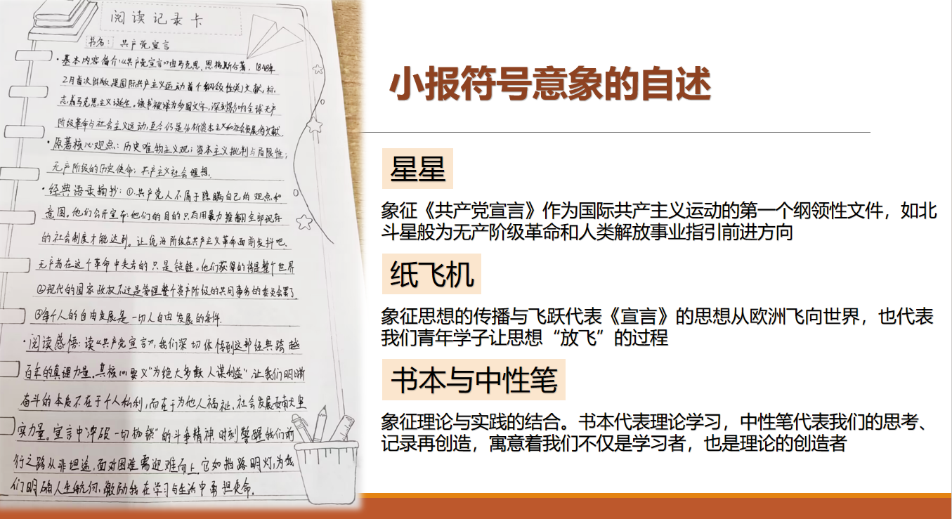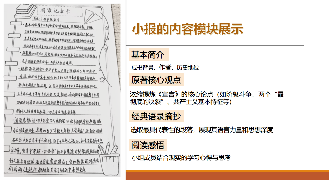 学生们制作的读书小报兼具思想性与观赏性,既提炼了《共产党宣言》的核心观点,又结合历史背景与现实意义展开延伸分析,以图文并茂的形式让理论表达更加生动鲜活。在分工协作中,各小组成员充分发挥自身优势,从资料搜集、内容梳理到小报设计、汇报展示,全程高效配合,不仅完成了学习任务,更锻炼了团队协作、沟通表达与责任担当等综合能力。