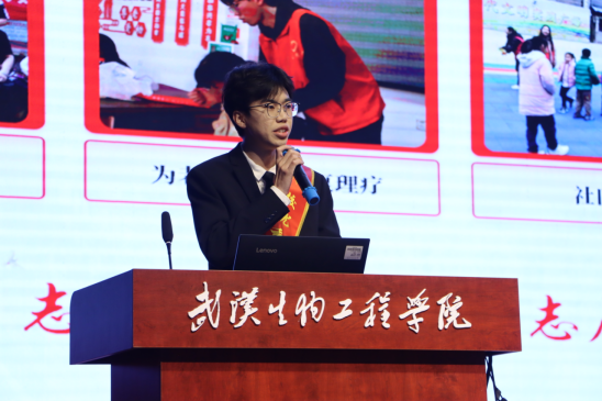 校五好学生标兵代表、建筑工程学院2021级土木工程1班何宇卓在校期间,学分绩点和专业课平均成绩连续三年专业第一,在国家及省级相关专业竞赛中斩获20余项大奖。会上,他从初心信仰、专业学习、团队协作、社会实践等方面分享了作为一名“建造者”的成长历程。