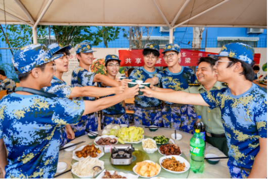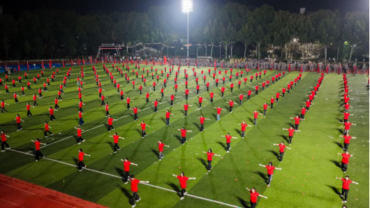 新生军训汇演,摆出“80”(纪念中国人民抗日战争暨世界反法西斯战争胜利80周年)和“自立自强、创新创业”(校训)字样,为祖国献礼