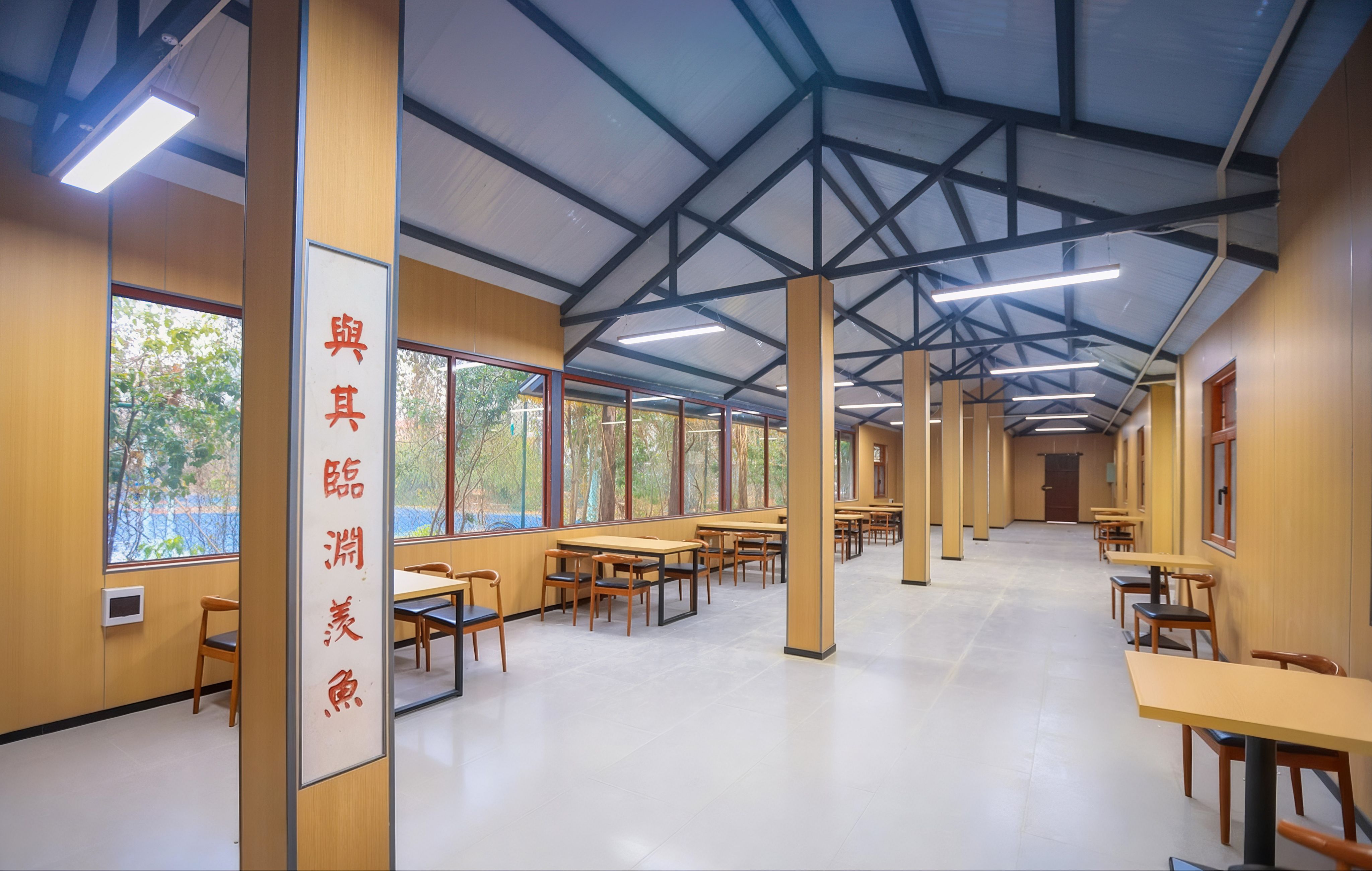 室内空间则以现代简约风格为主调,浅木色桌椅排列有序,兼顾舒适性与实用性;两侧通透玻璃幕墙巧妙引入室外景致,实现自然与人文的有机交融。柱间悬挂的红底黑字书法作品,笔力遒劲、意蕴深厚,为空间平添浓郁的文化气息,彰显书院“以文化人、以美润心”的核心理念。
