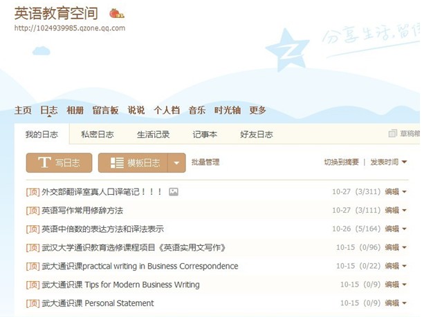 在这个名为“英语教育空间”的QQ空间里,赵一君老师通过编写各种各样的代码来打造自己的空间动画、DIY视频和PPT网络链接。这里面不仅上传了《英语写作常用修辞方法》、《英语中倍数的表达方法和译法表示》等专业英语学习技巧,还有《新东方2013英语四六级改革后全新备考指南》以及《官方外事2158道中国菜的英文译法》、《汽车各部位中英文名称及故障处理》等应用型很强的学习资料。尤其是作为武汉大学慕课(MOOC)《英语实用文写作》官方链接渠道的武大通识课程PPT系列和外交部翻译室真人口译笔记等,为同学们打开了一扇通往知识、实践、成功的大门,大家争先恐后地点击和转载博客空间的内容,掀起了在线学习的热潮。