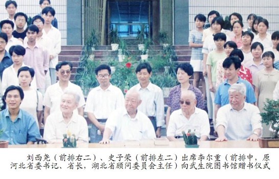 刘老非常关注我校图书馆建设。他说,图书馆是一所高校的三大支柱之一,丰富的馆藏要靠平时积累,还要寻求社会各界人士捐赠。他为此亲自鼓动老同志、老专家向我校开展捐赠图书活动。李尔重、史子荣、章文才等很多湖北省德高望重的老领导、老专家向我校开展捐赠图书活动时,他都要亲自出席捐赠仪式。刘老亲自著述的《攀峰与穿雾:刘西尧回忆录》刚出版,他立即向武生院捐赠一批图书。在他的影响下,短短几年时间,老同志向我校捐赠图书达几万册。