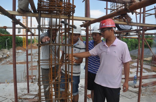 来到工地上时,同学们正在聚精会神地检查焊接钢筋的质量。陈有堂是2011级建筑工程技术专科5班的学生。没来工地前,他对学习总也提不起兴趣,经常旷课,晚上玩游戏到很晚。付萧宾调侃他“没有斗志,很颓废”。现在的陈有堂好像变了个人,精神面貌发生了很大转变,不再上网玩游戏了,每天早上按时到达工地,每天晚上看专业书籍。由于基础不是很好,陈有堂特别喜欢问问题,哪怕遇到一个简单的问题,他也会追着指导老师、技术工人和一同实习的同学问,直到弄清楚为止。