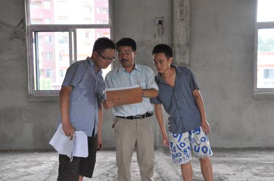 陶足云(中)在长城公社施工现场讲室内装修规划