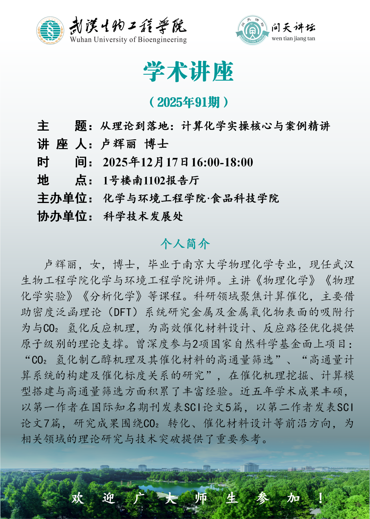【问天讲坛】卢辉丽博士作题为“从理论到落地:计算化学实操核心与案例精讲”科研讲座预告