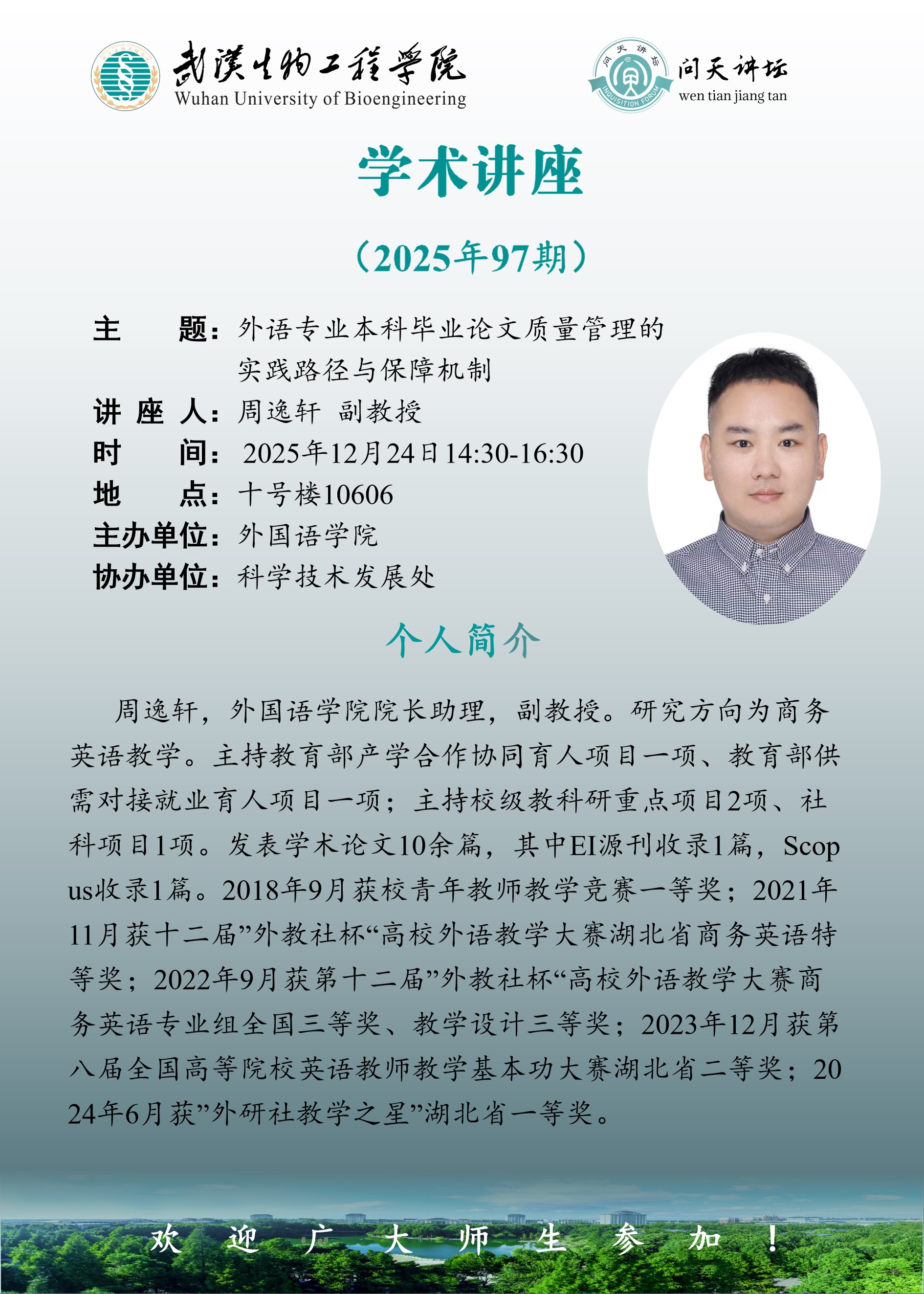 【问天讲坛】周逸轩副教授作题为“外语专业本科毕业论文质量管理的实践路径与保障机制”科研讲座预告