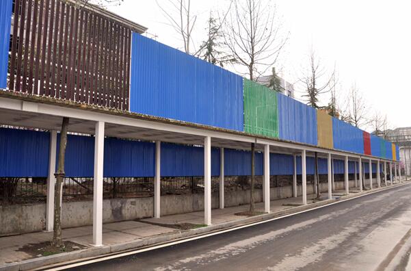 外国语学院文化长廊位于校园松江路东侧,外国语学院教学楼和外教二期公寓之间。其中,展示区长约50米,分为上下两层,部分为透视栏杆造型。如图所示: