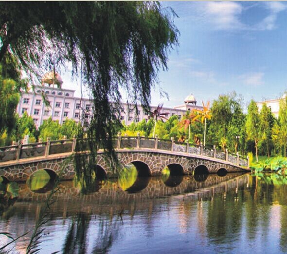 问天湖是我校第二大人工湖,始建于2002年,其形如一把开启智慧的钥匙,寓意为我校师生培育和传承一种问天(注:“天”特指大自然中的未知世界)的探索精神。湖边垂柳依依,湖面碧波荡漾;九孔桥如长虹卧波,索拉桥与武汉长江二桥异曲同工,横跨东西两岸。闲暇时,师生在湖边或休憩、或散步、或品读、或摄影,成为许多武生院人心中的永恒记忆。