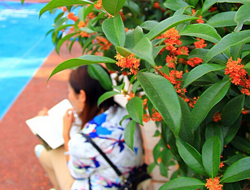 桂花,又名木樨、岩桂,系木樨科常绿灌木或小乔木。质坚皮薄,叶长椭圆形面端尖,对生,经冬不凋。花生叶掖间,花冠合瓣四裂,形小。其品种有金桂、银桂、丹桂、月桂等。桂花是中国传统十大花卉之一,集绿化、美化、香化于一体的观赏与实用兼备的优良园林树种。桂花清可绝尘,浓能远溢。尤其是仲秋时节,丛桂怒放,夜静月圆之际,把酒赏桂,陈香扑鼻,令人神清气爽。在中国古代的咏花诗词中,咏桂之作的数量也颇为可观,如《江南靖士诗稿·桂花》:“瑶树静当严序来,百花杀后此花开。清贞更造清芬境,大地萧条赖挽回。”咏物含喻,寓寄崇尚。以桂花做原料制作的桂花茶是中国特产茶,它香气柔和、味道可口,为大众所喜爱。桂花在园林建设中有着广泛的运用。