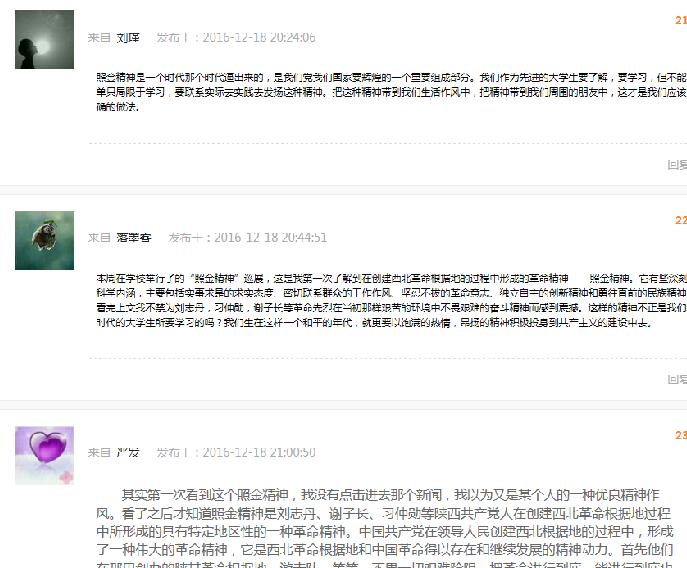学生党员林家峰在易班讨论中表示:“从纪念长征胜利80周年“照金精神”巡展的参观学习之中,我体会到了“照金精神”的深刻含义。作为一名大学生,我们就应该秉持革命先辈的光辉品质,始终保持坚忍不拔的革命意志、独立自主的创新精神和勇往直前的民族品质,现在刻苦学好专业知识,练就过硬本领,将来全力报效国家,发愤振兴中华。”