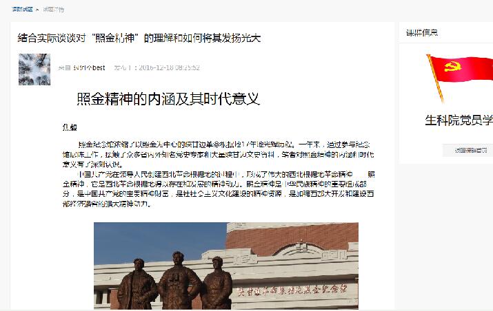 本网讯(通讯员 黄朝辉)最近,纪念长征胜利80周年“照金精神”巡展在我校晨光湖广场隆重举行。伴随着全校师生员工纷纷前往参观学习,生命科学与技术学院党员工作站特地在易班“两学一做”网上党校开设专题,发布关于照金精神的内涵及其时代意义的话题,组织学生党员展开深入的学习研讨互动。